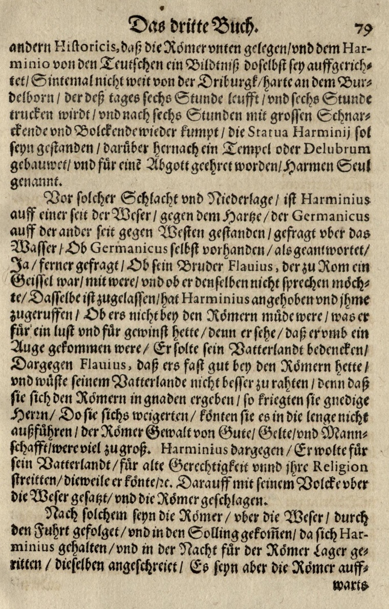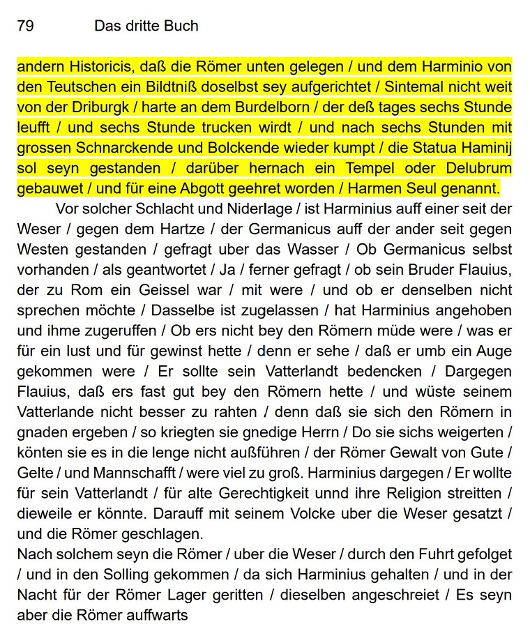 „Das gegenspiel erfindt sich aber auß dem Paterculo und andern Historicis, daß die Römer unten gelegen / und dem Harminio von den Teutschen ein Bildtniß doselbst sey aufgerichtet / Sintemal nicht weit von der Driburgk / harte an dem Burdelborn / der deß tages sechs Stunde leufft / und sechs Stunde trucken wirdt / und nach sechs Stunden mit grossen Schnarckende und Bolckende wieder kumpt / die Statua Haminij sol seyn gestanden / darüber hernach ein Tempel oder Delubrum gebauwet / und für eine Abgott geehret worden / Harmen Seul genannt.“ Ein klarer Hinweiß auf das Quellwunder am Fuße der Iburg wo sich das Heerlager 3 Tage befand.
